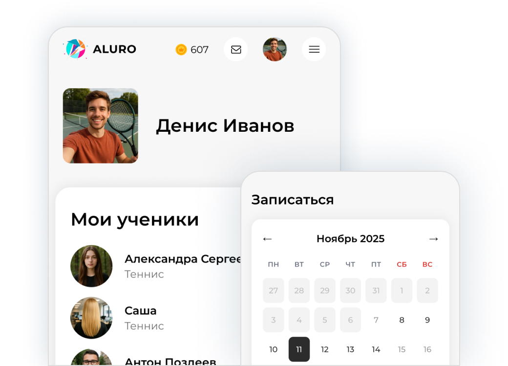 ALURO наводит порядок: онлайн-запись, задания и комментарии — всё в одном месте. Ученики видят прогресс и получают домашнюю работу, а напоминания о занятиях приходят автоматически — меньше пропусков и лишних переписок. Вы выглядите системным, современным профессионалом и освобождаете время от рутины, чтобы сосредоточиться на тренировках.
