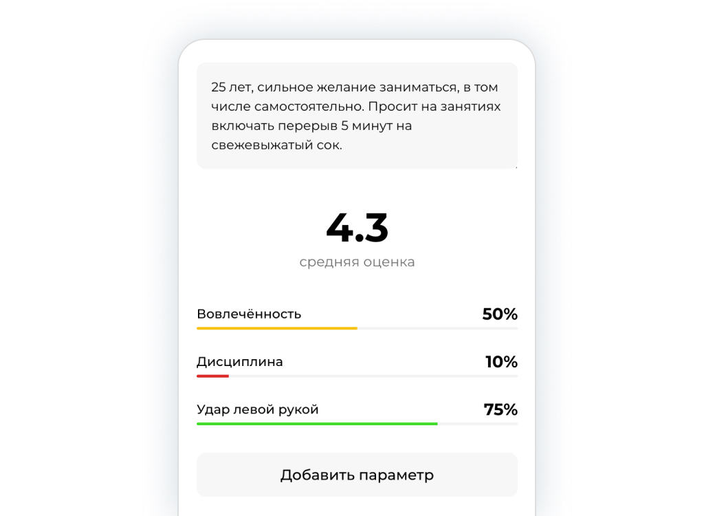 Профили учеников: цели, прошлый опыт и ограничения — всё под рукой. Добавляйте личные заметки, фиксируйте оценки последних занятий и задавайте свои критерии оценки результата. Персональный подход к каждому ученику даже после долгого перерыва.