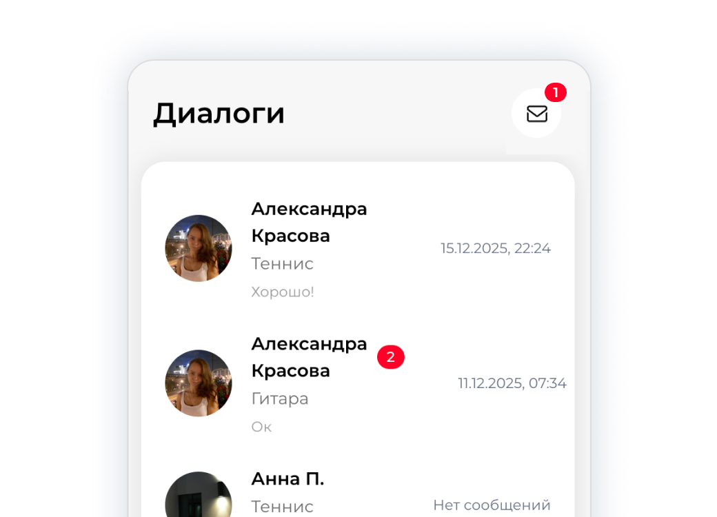 Диалоги с учеником, обратная связь после тренировки, комментарии к занятиям (видны ученику) и личные заметки (видны только вам). Не нужно искать переписку по мессенджерам и вспоминать, о чём договорились. Меньше путаницы и вопросов, больше дисциплины и доверия.