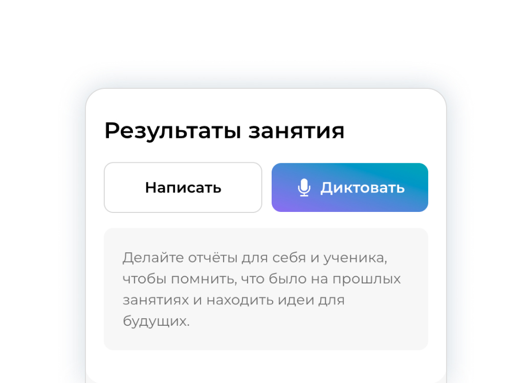 Создавайте заметки и отчёты о тренировках голосом — что делали и как прошло занятие. Для себя и ученика: меньше забытых деталей, а умные домашние задания — точнее, потому что учитывают историю прошлых тренировок.